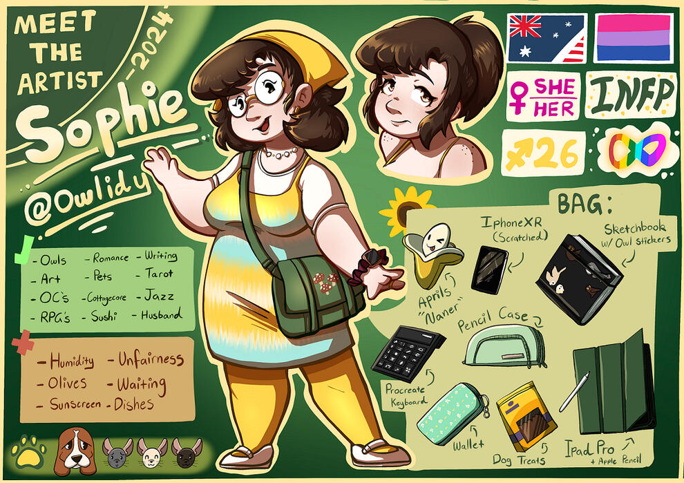 Sophie, or as known by her screenname "Owlidy", is an Australian born and raised artist, whom just recently moved to Texas, USA. She has been learning to draw for as long as she could pick up a pencil, but didn't push for art as a career until receiving her Diploma of Games Design in 2017, the years after this is where her improvement began to grow. As a result, she started to learn Live2D Cubism in 2019 and then continued on taking both Art and Live2D commissions as a business in February 2020.Owlidy prefers a cartoony style with anime inspired elements and her favorite type of art is character design; specifically playing around with common character tropes.Some future endeavors Owlidy intends to work towards is her online business called "My Mentifery", focusing on physical goods such as stickers, prints and other memorabilia of both original and fandom art.